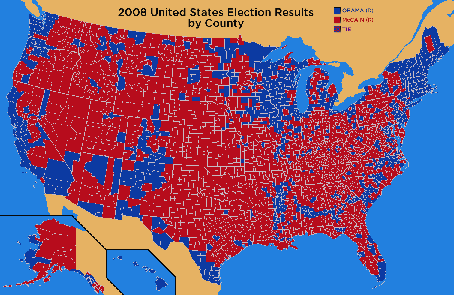 I found some interesting graphics yesterday of the red versus blue counties in the United States.