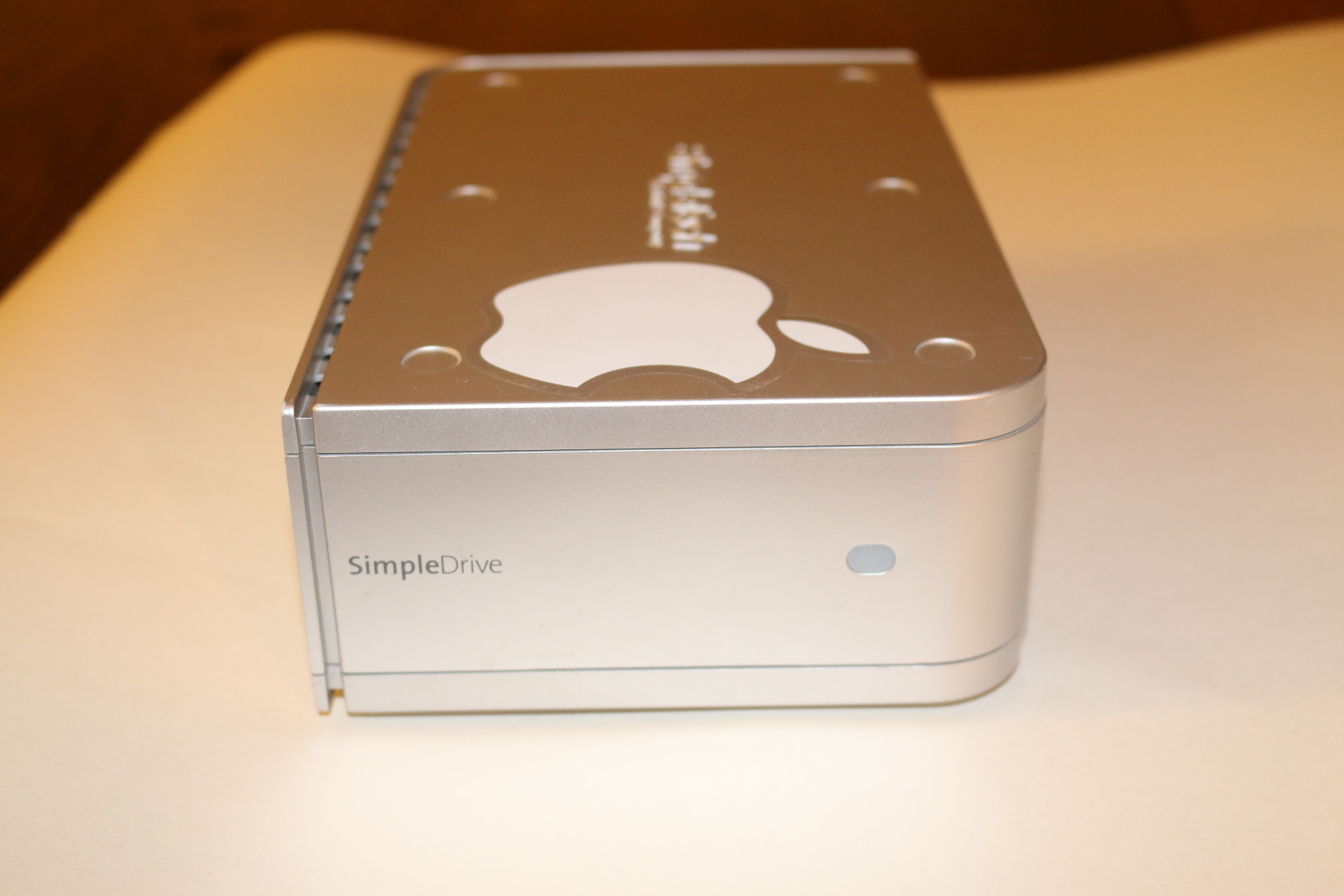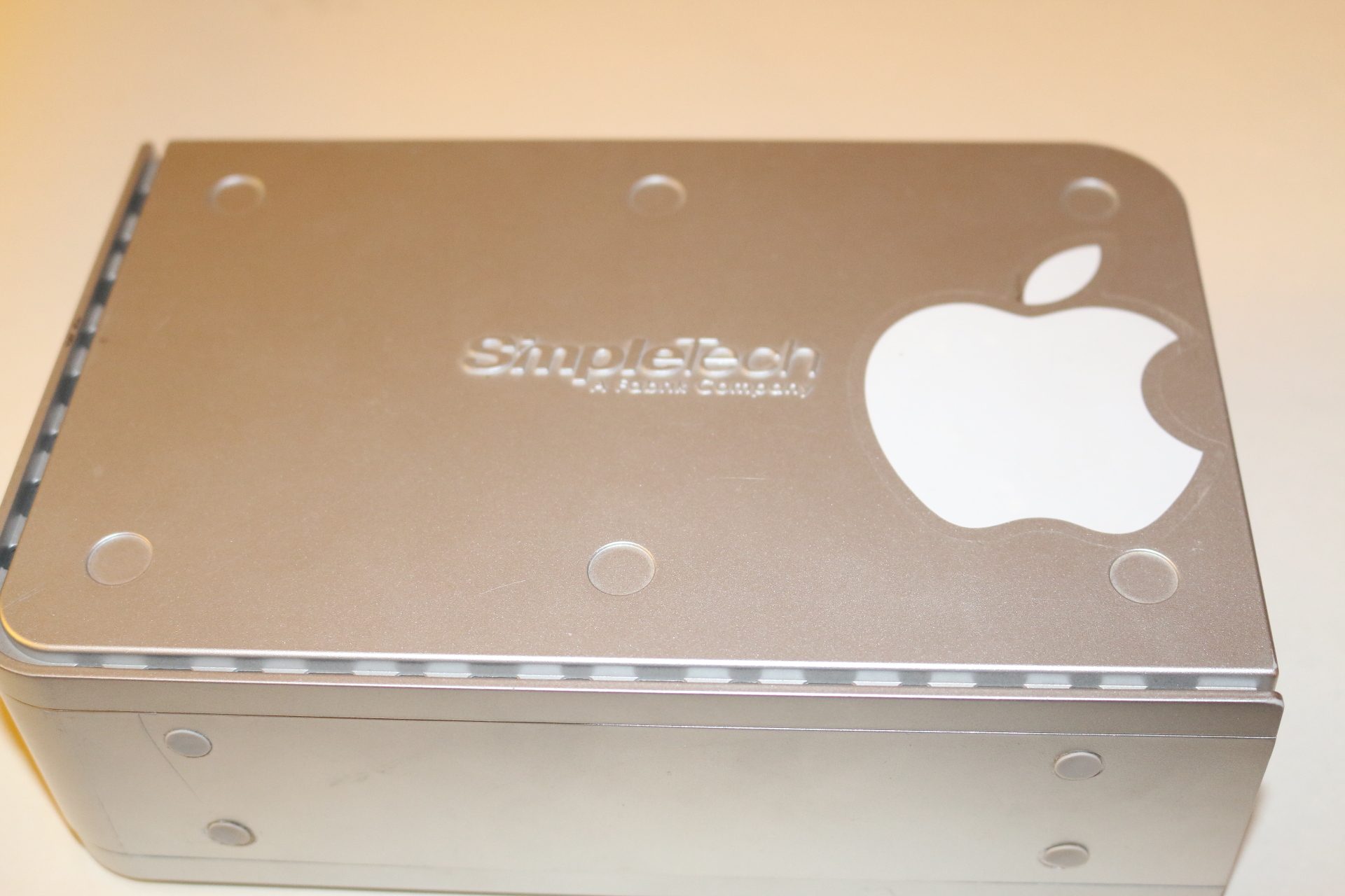 SimpleTech external storage unit with Apple logo on top.