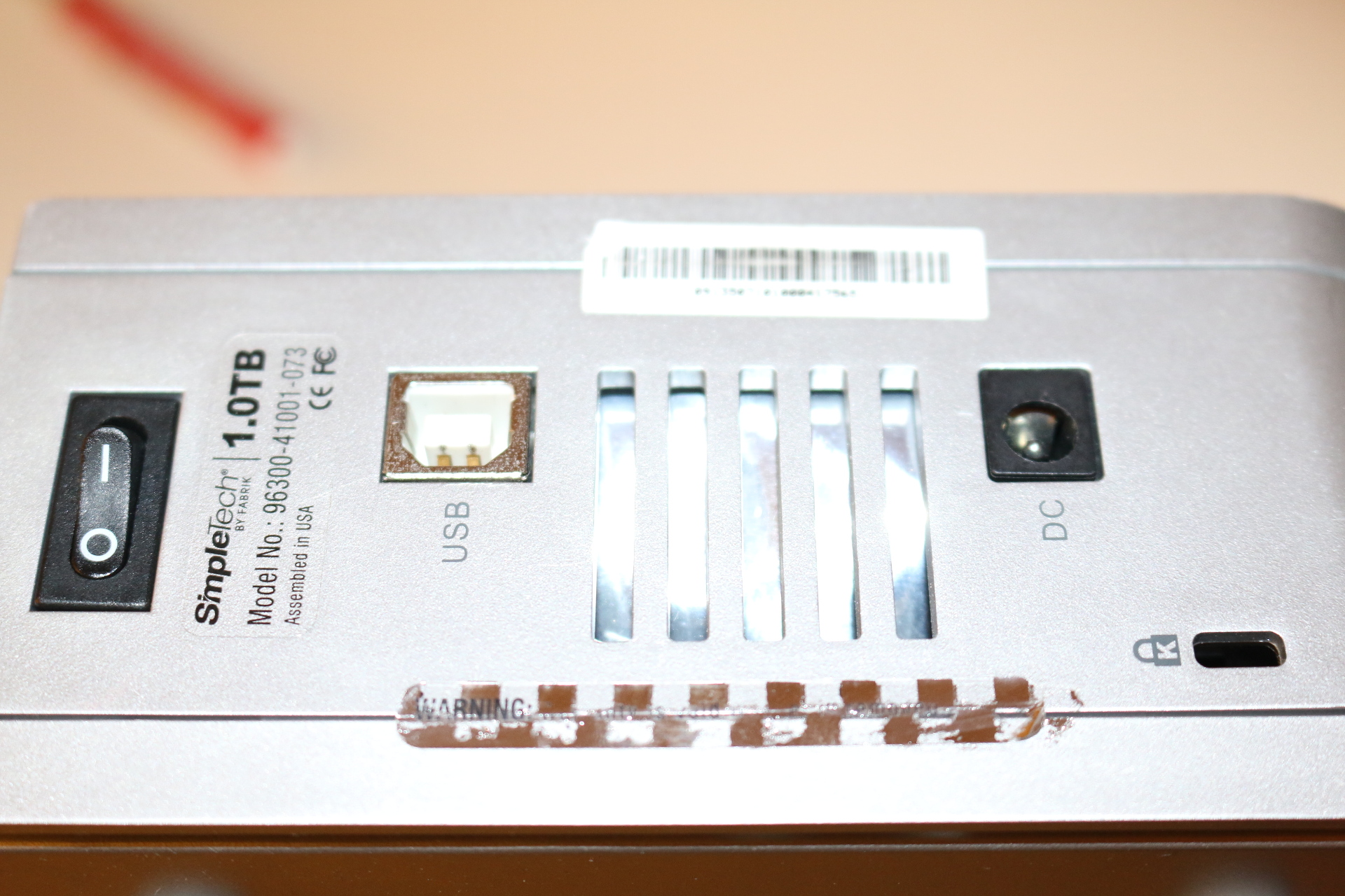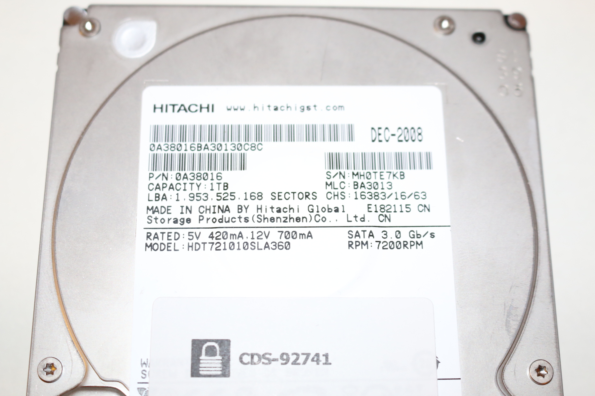 Closeup of hard drive sticker with drive specs.
