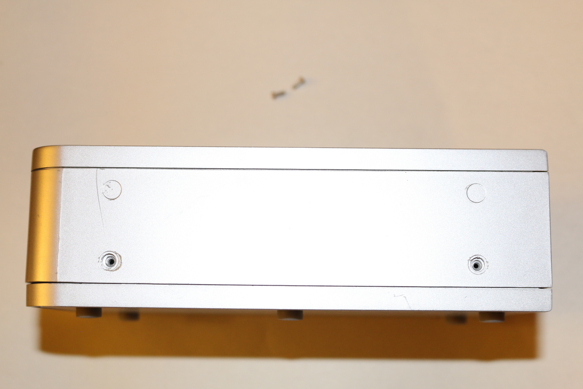 View with both tiny screws removed, before opening enclosure.