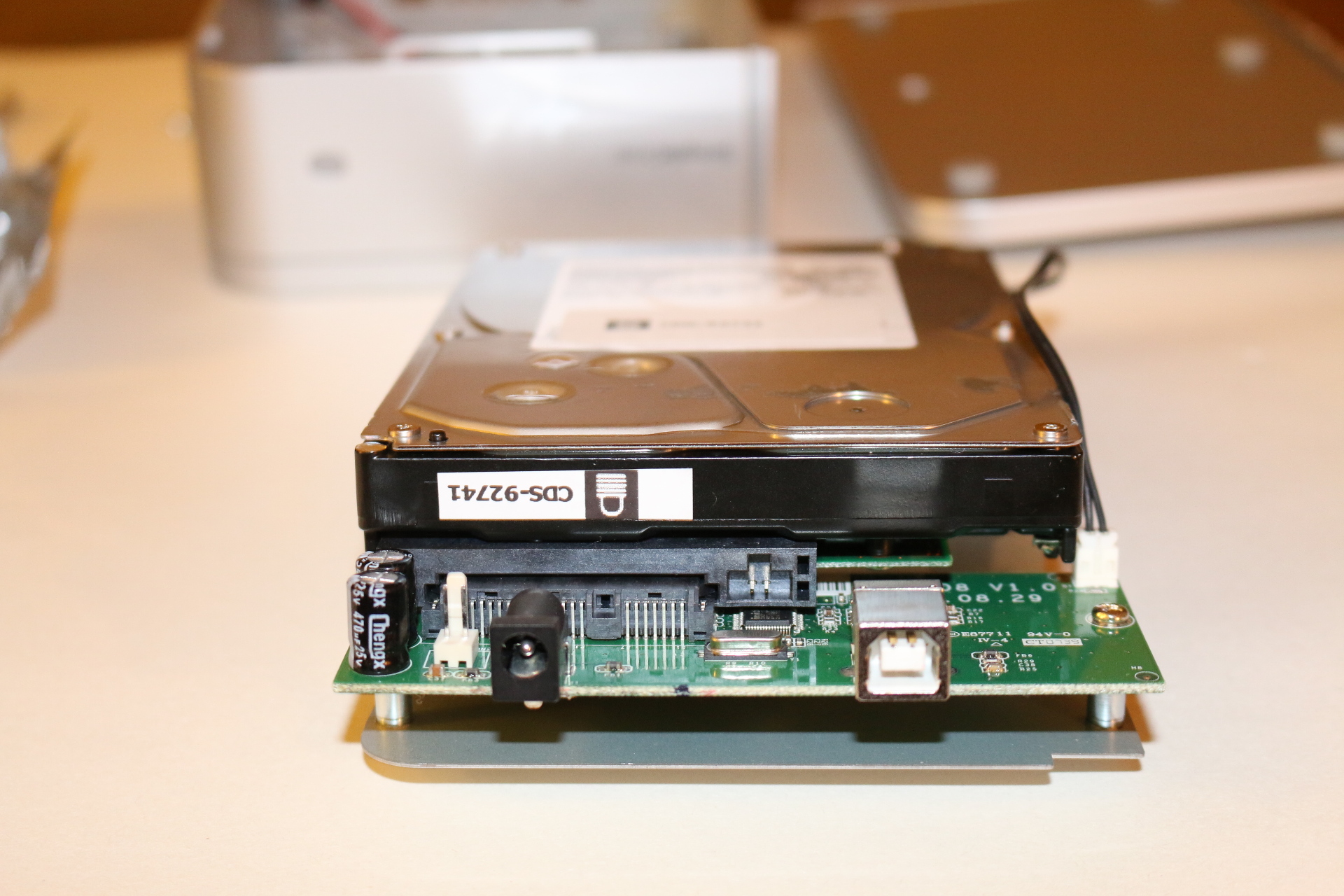 USB interface carriage next to Hitachi hard drive.
